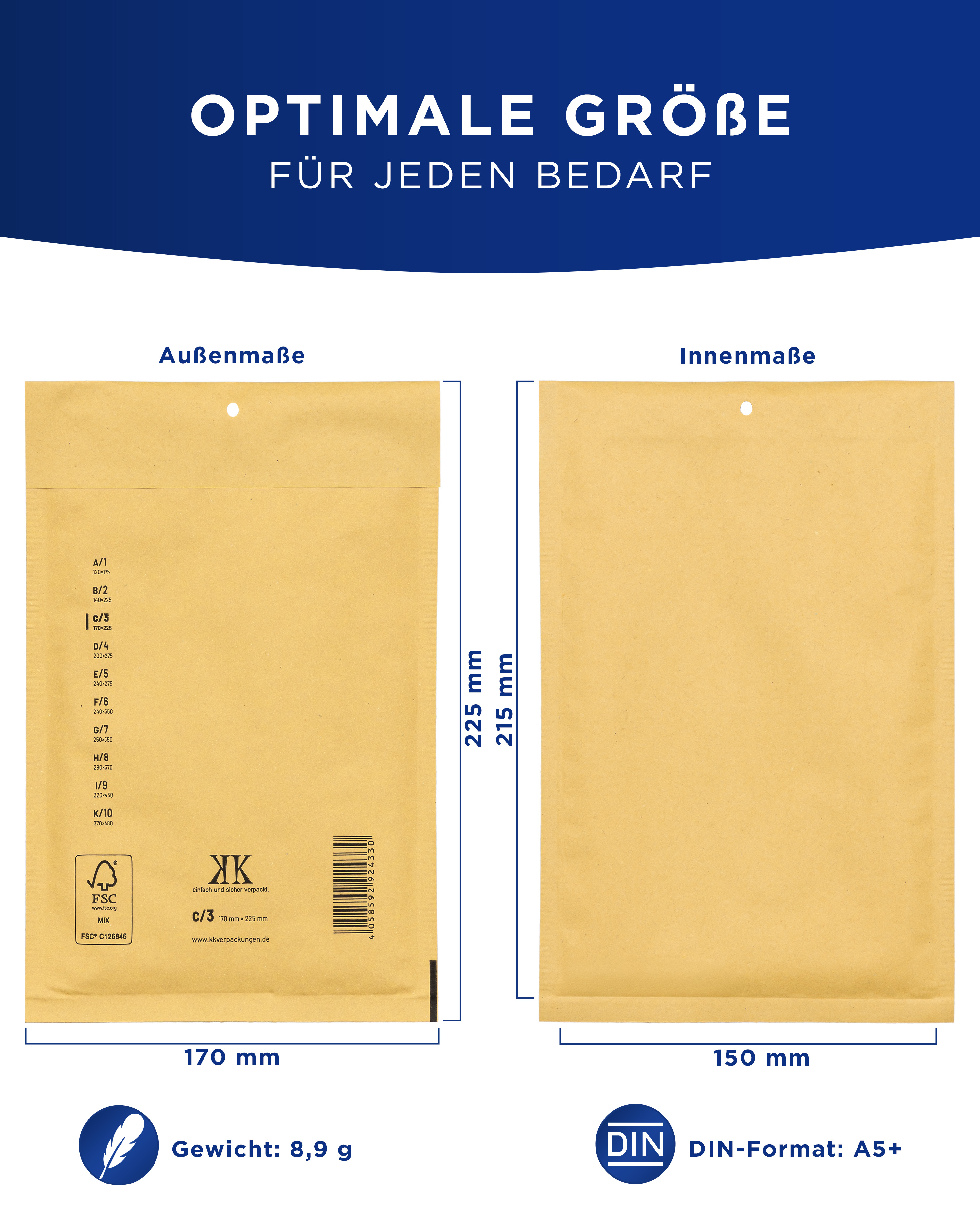 Die Luftpolster-Versandtaschen im Format C3 haben Innenmaße von 150 x 215 mm und Außenmaße von 170 x 225 mm (unbefüllt). Sie sind speziell für den Versand von Produkten im DIN A5+ Format (flach) konzipiert und bieten eine ideale Lösung, um empfindliche Gegenstände sicher zu verpacken und zu versenden. Diese Luftpolstertaschen bieten ausgezeichneten Schutz und sorgen dafür, dass Ihre Sendungen sicher und unbeschädigt an ihrem Bestimmungsort ankommen.