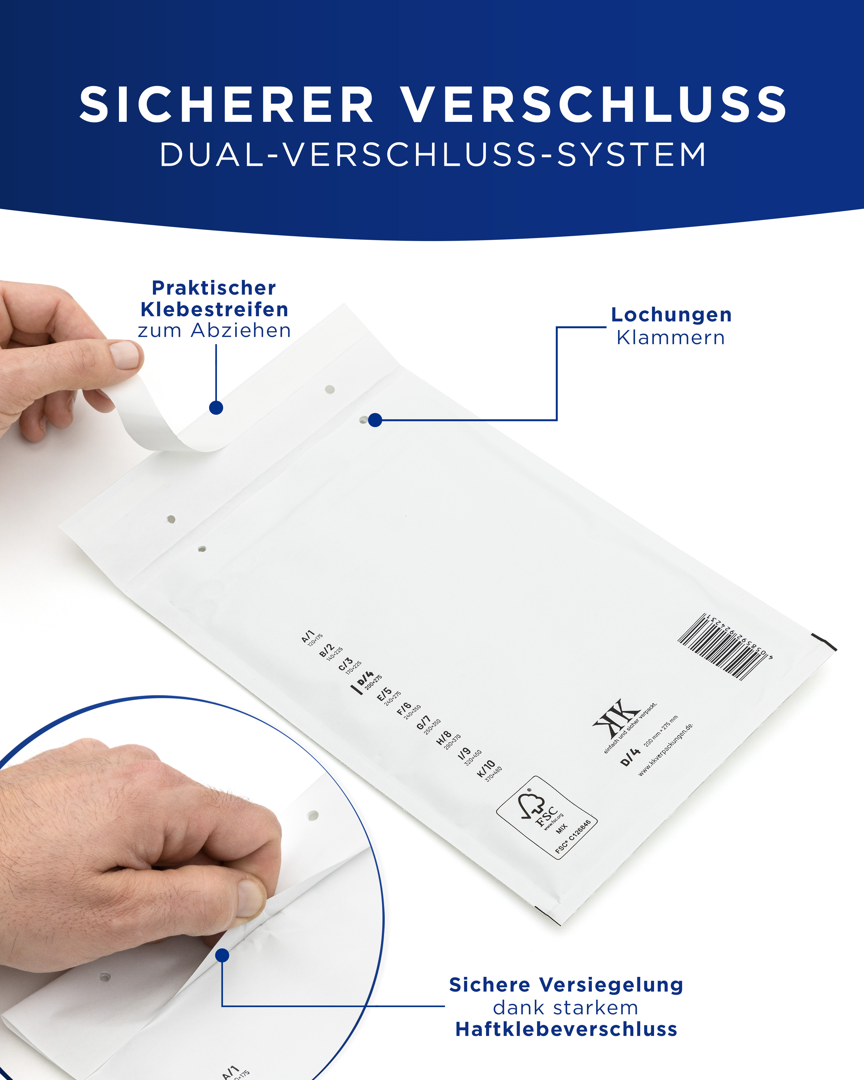 Unsere Luftpolster-Versandtaschen verfügen über einen robusten selbstklebenden Haftverschluss, der eine stabile und sichere Versiegelung bietet. Der Klebestreifen sorgt für eine sichere und manipulationssichere Versiegelung. Zusätzlich bieten wir ein Dual-Verschluss-System, das neben dem klassischen Haftklebeverschluss auch Lochungen für einen Klammerverschluss enthält, wodurch die Versandtaschen noch flexibler und vielseitiger einsetzbar sind.