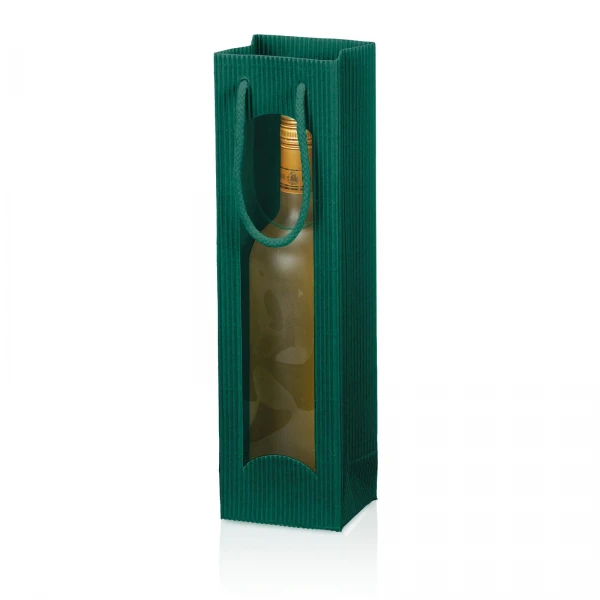 Ob im Weinhandel, in der Gastronomie oder im Feinkostgeschäft – wenn Sie eine einzelne Flasche als Geschenk oder Mitnahmeprodukt verpacken möchten, brauchen Sie eine Lösung, die praktisch ist und gleichzeitig etwas hermacht. Diese Tragetüte in Grün verbindet beides: Die offene Wellpappe gibt der Verpackung eine moderne, strukturierte Optik, die sich bewusst von glatten Standardtüten abhebt. Das transparente Sichtfenster sorgt dafür, dass Ihre Kundinnen und Kunden die Flasche direkt erkennen, ohne die Verpackung öffnen zu müssen – ein klarer Vorteil im Verkaufsumfeld.
