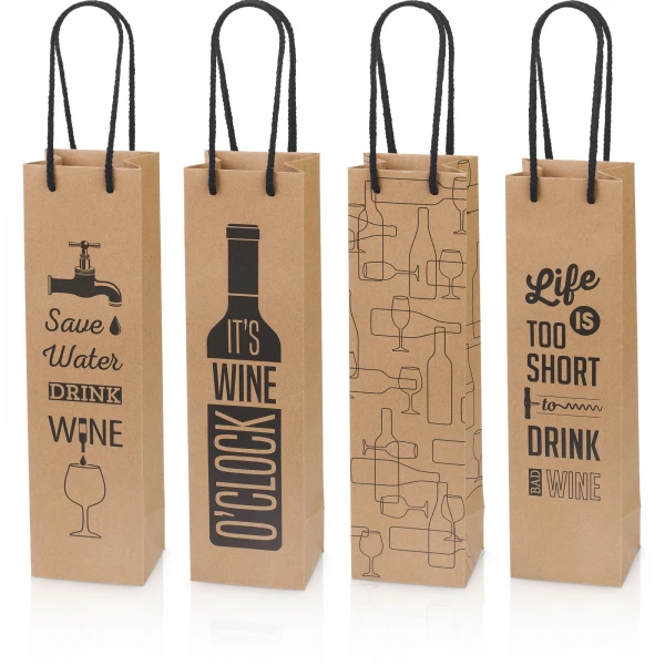 Das Sortiment umfasst vier verschiedene Designs, sodass Sie für unterschiedliche Anlässe und Zielgruppen die passende Optik zur Hand haben. Gerade wenn Weinpräsente in größerer Stückzahl verpackt werden müssen, spart Ihnen das wertvolle Zeit: Flasche hineinstellen, Tüte am Tragegriff übergeben – fertig. Aufwendiges Verpacken mit Geschenkpapier und Schleifen entfällt komplett.