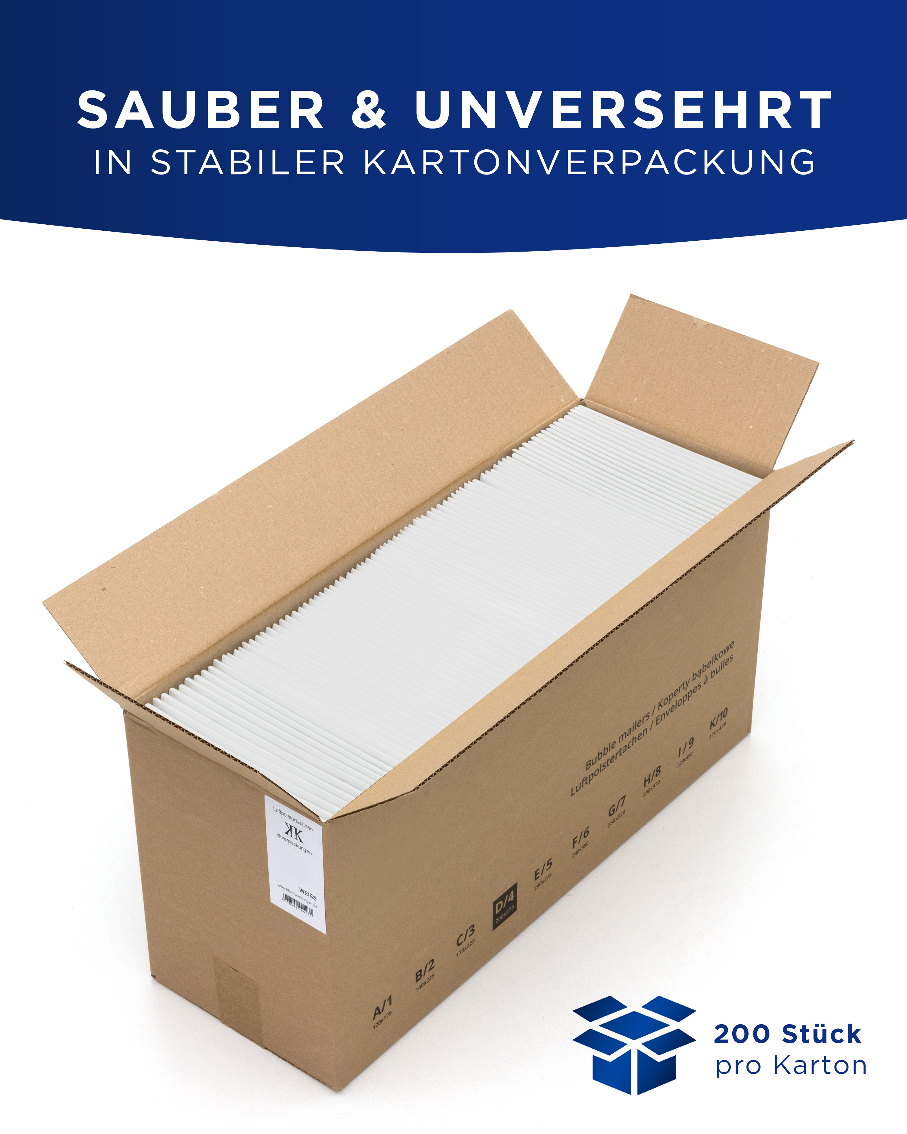 - Innenmaterial: LDPE Sperrschicht-Luftpolsterfolie mit einer Stärke von 50 my