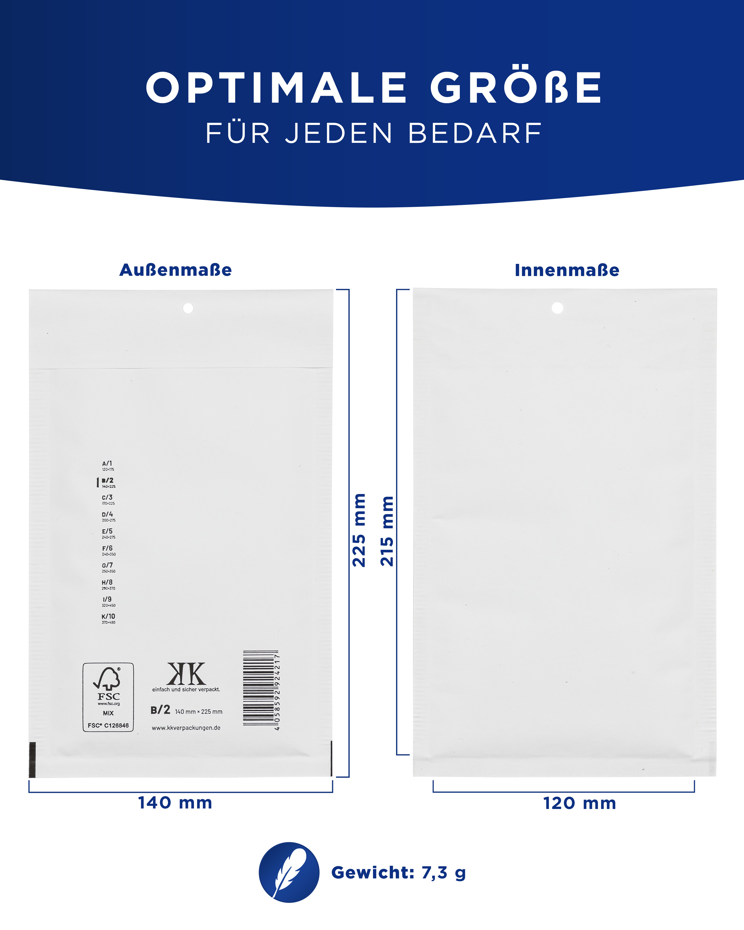 Die Luftpolster-Versandtaschen im Format B2 haben Innenmaße von 120 x 215 mm und Außenmaße von 140 x 225 mm (unbefüllt). Sie bieten eine ideale Lösung, um empfindliche Gegenstände sicher zu verpacken und zu versenden. Diese Luftpolstertaschen bieten ausgezeichneten Schutz und sorgen dafür, dass Ihre Sendungen sicher und unbeschädigt an ihrem Bestimmungsort ankommen.