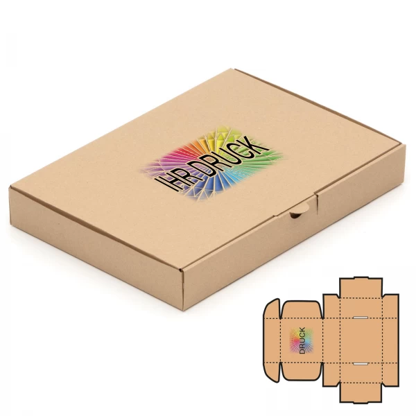 Mit diesem bedruckten Maxibriefkarton im Format A4/B4 versenden Sie flache Waren und machen gleichzeitig Ihre Marke auf dem Versandweg sichtbar. Der Karton ist nach FEFCO 0426 konstruiert – eine bewährte Faltschachtel-Bauart, die das Aufrichten und Verschließen im Packprozess erleichtert. Die Außenmaße betragen 350 x 250 x 50 mm (Innenmaße: 333 x 244 x 46 mm) bei einem Gewicht von nur 0,09 kg.