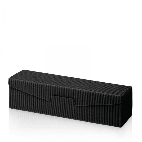 Ob Weinpräsent für Geschäftspartner, saisonales Kundengeschenk oder Verkaufsverpackung im Direktvertrieb – dieser Präsentkarton gibt einzelnen Wein- oder Sektflaschen einen angemessenen Rahmen. Das schlichte Schwarz in Kombination mit der sichtbaren Wellenstruktur wirkt modern und zurückhaltend zugleich, sodass der Karton zu jedem Anlass und jeder Marke passt, ohne mit auffälligen Motiven in Konkurrenz zu treten.