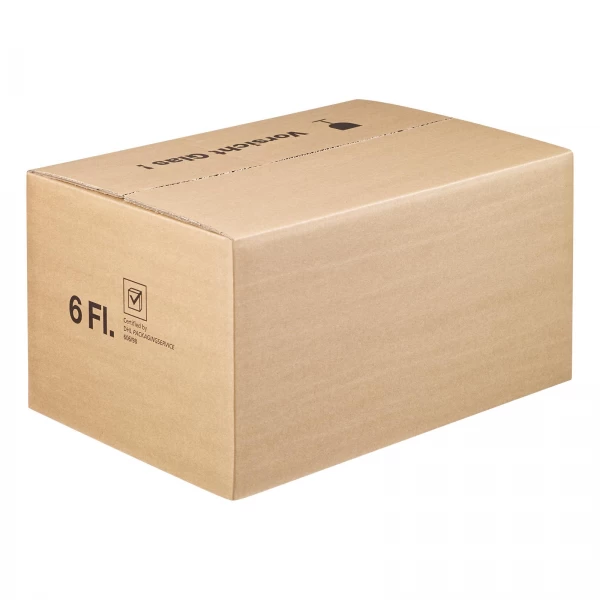 Mit den Innenmaßen von 400 x 280 x 220 mm (Außenmaße: 430 x 300 x 235 mm) bietet der Karton Platz für bis zu 6 Flaschen mit einer maximalen Länge von 380 mm. Die Flaschen bleiben während des gesamten Transportwegs fixiert und gegen Stöße geschützt. Gleichzeitig eignet sich der Karton als Überverpackung für 6er Geschenkkartons, wenn Sie fertig konfektionierte Präsente an Ihre Kunden oder Geschäftspartner versenden möchten.