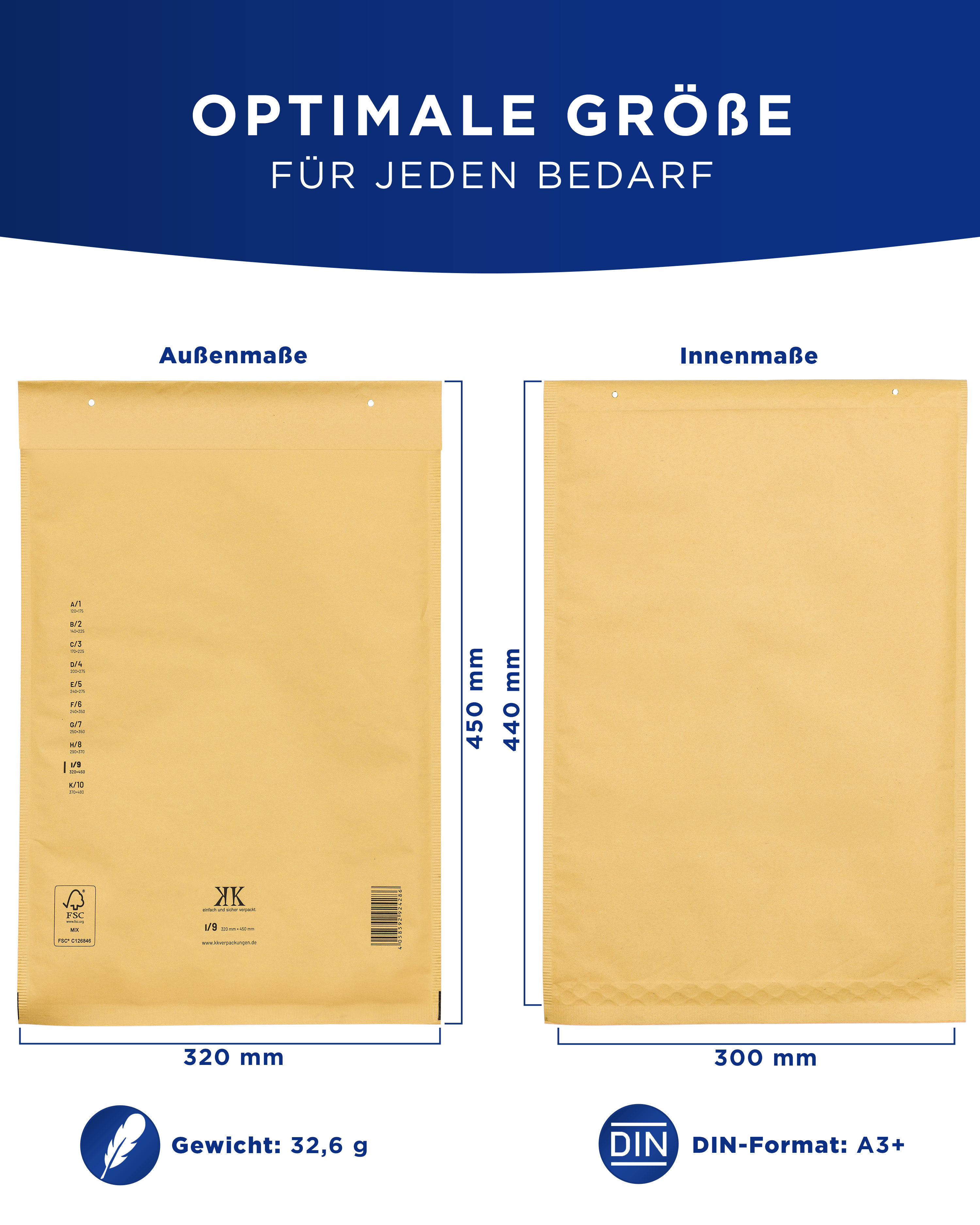 Die Luftpolster-Versandtaschen im Format I9 haben Innenmaße von 300 x 440 mm und Außenmaße von 320 x 450 mm (unbefüllt). Sie sind speziell für den Versand von Produkten im DIN A3+ Format (flach) konzipiert und bieten eine ideale Lösung, um empfindliche Gegenstände sicher zu verpacken und zu versenden. Diese Luftpolstertaschen bieten ausgezeichneten Schutz und sorgen dafür, dass Ihre Sendungen sicher und unbeschädigt an ihrem Bestimmungsort ankommen.
