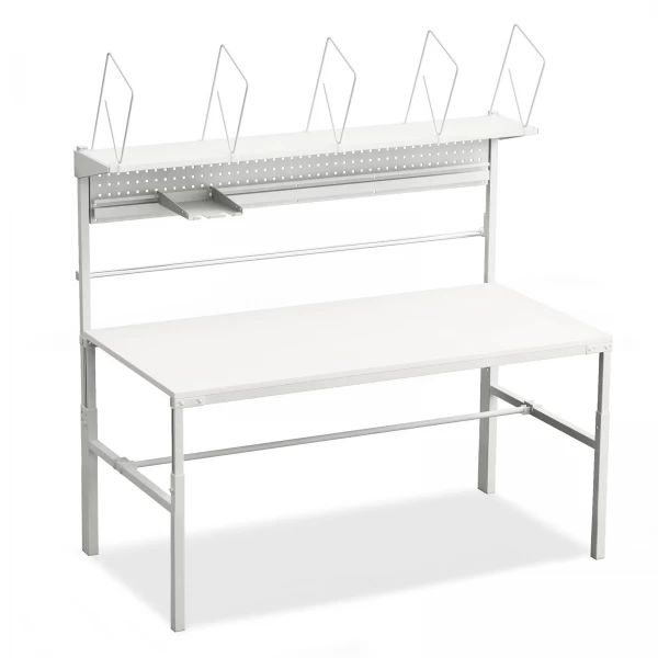 Das Set bringt alles mit, was einen funktionierenden Packplatz ausmacht. Die beiden Papierrollenhalter nehmen Füllmaterial- oder Packpapierrollen griffbereit auf, Dokumente wie Lieferscheine oder Versandlabels liegen in der A4-Dokumentenablage geordnet vor, und über die höhenverstellbare Lochplatte lassen sich Werkzeuge, Messer oder Klebebandabroller genau dort befestigen, wo Sie sie brauchen. Der Unterteilerbügel (40 cm) sorgt dafür, dass unterschiedliche Materialien auf dem höhenverstellbaren Etagenbord sauber getrennt bleiben. Ihre Mitarbeiter greifen, ohne zu suchen – das verkürzt die Bearbeitungszeit pro Paket spürbar.