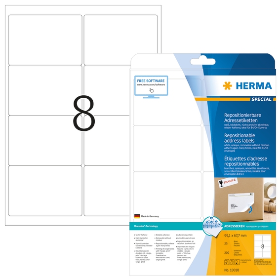 Selbstklebende Etiketten auf A4-Blättern. Mit Movables®-Technology: sicher haftend auf allen glatten, trockenen, unbeschädigten und staubfreien Flächen, rückstandsfrei wieder abziehbar ohne den Untergrund zu beschädigen, problemlos repositionierbar und mehrfach wieder haftend. Ideal für zeitlich befristete oder wechselnde Kennzeichnungen und Oberflächen, die nicht beschädigt werden sollen. Sehr gute Druckergebnisse auf allen Laser- und Inkjetdruckern, Kopierern, Farblaserdruckern und Farbkopierern. Störungsfreie Verarbeitung durch Rundum-Sicherheitskante und optimale Planlage. Umweltfreundlich: FSC® Mix Credit-zertifiziert, chlorfrei gebleicht, lösemittelfreier Haftkleber. Etiketten sind 100 % recyclingfähig mit dem Altpapier, Verpackung aus Recyclingkarton. Kostenlose Softwarelösungen: www.herma.de/software.