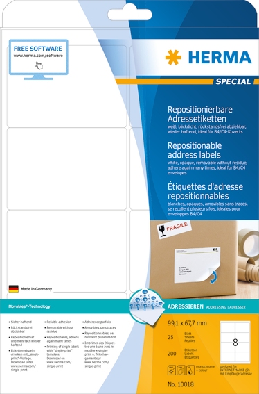 HERMA 10018 Repositionierbare Adressetiketten A4 99,1x67,7 mm we