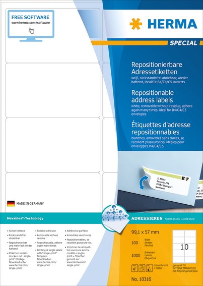 HERMA 10316 Repositionierbare Adressetiketten A4 99,1x57 mm weiß Movables Papier matt 1000 St.