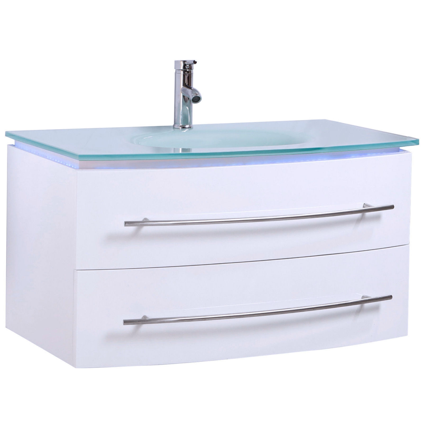 Unser einzigartiges Badmöbel-Set besteht aus bruch- und biegefestem MDF Holz, dessen Oberfläche aus Qualitätsgründen nicht foliert sondern lackiert ist. Somit ist dieses besonders langlebig und resistent gegen Feuchtigkeit. Der Unterschrank ist mit einem Waschtisch aus temperiertem Glas konzipiert und mit geräumigen Schubladen ausgestattet, welche durch ihre chromglänzenden Metall-Griffe und ihre integrierten Soft-Close-Systeme sowohl optisch als auch funktional höchste Kompatibilität bieten. Ein besonderes Highlight des Unterschrankes ist das blaue LED-Licht unterhalb des Waschtisches, das sich durch ein Touchpad an der rechten Seite des Schrankes ganz einfach ein- und ausschalten lässt. Der Spiegel oberhalb des Schrankes verfügt ebenfalls über ein stromsparendes weißes LED-Licht und eine Touch-Funktion. Ergänzend zum Spiegel befindet sich gleich darunter eine praktische Ablagefläche. Der Hochschrank an der rechten Seite bietet einen zusätzlichen Stauraum. Dadurch, dass unsere Schränke bereits vormontiert geliefert werden, können Sie das Set ganz einfach und mit wenig Zeitaufwand zusammenbauen. Alles in allem überzeugt unser Badmöbel-Set sowohl durch seine schicke Optik als auch durch seine praktischen Funktionen.