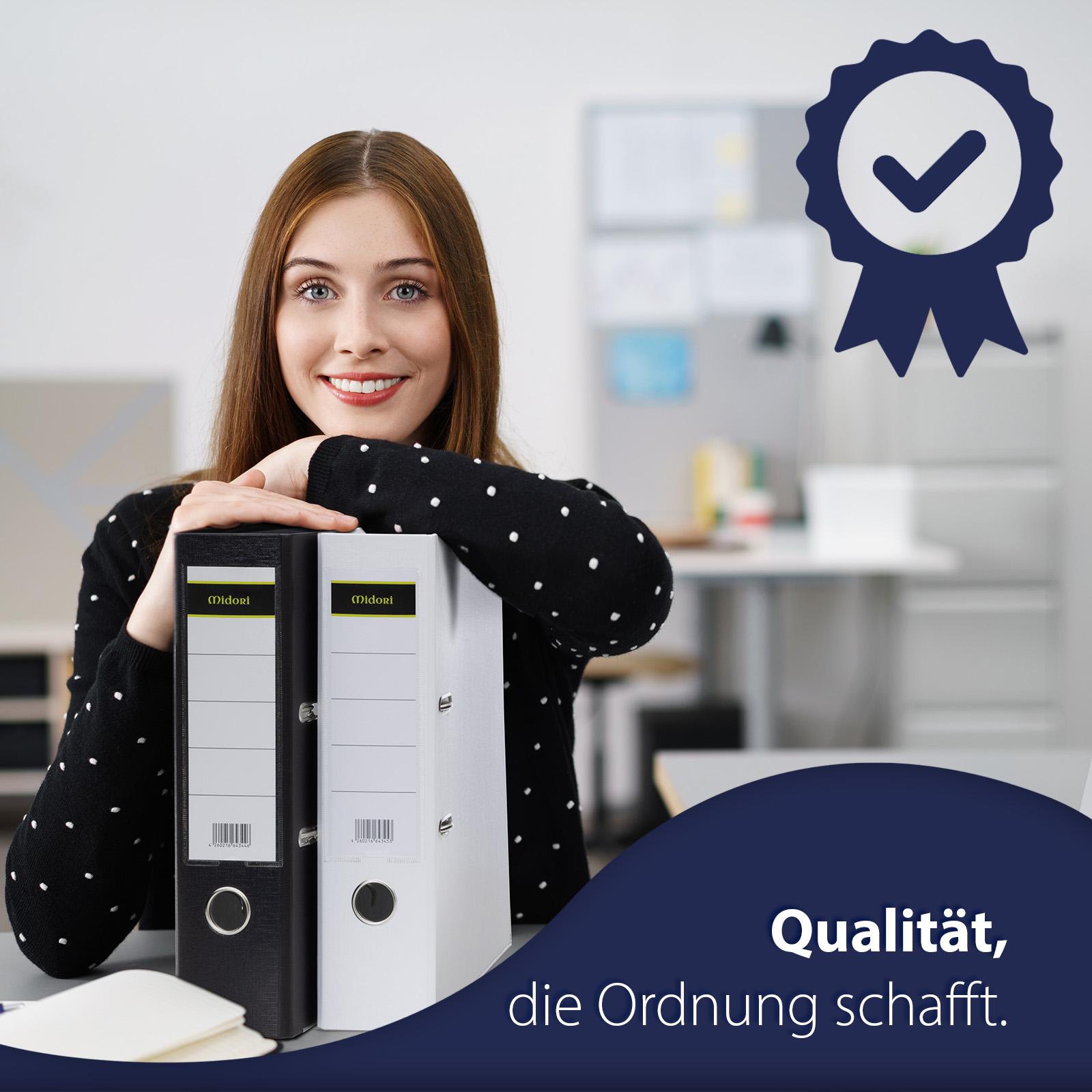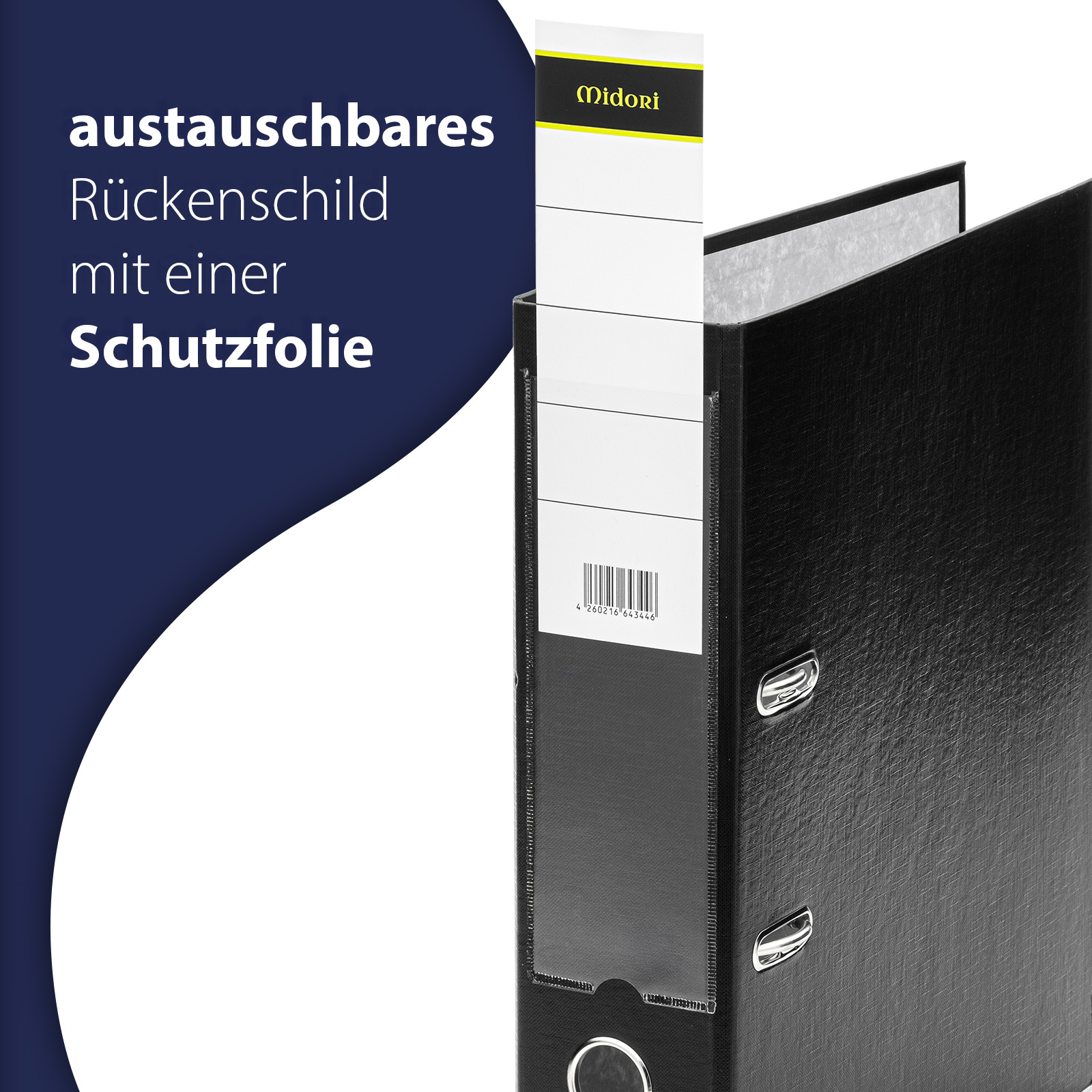 Die Ordner sind auf dem Rücken mit auswechselbaren Rückenschildern versehen. Auf dieses kann der Inhalt des Ordners in Form einer groben Umschreibung notiert werden. Das unterhalb des Rückenschildes befindliche Griffloch erleichtert die rasche Entnahme eines einzelnen aus einer Ansammlung weiterer Ordner in einer Fachreihe in Regal oder Schrank. Die Vorderdeckel der Ordner sind mit Raumsparschlitzen im Abstand der 8-cm-Lochung ausgestattet. Mit Hilfe der Schlitze im Vorderdeckel entsteht eine hohe Standsicherheit im Ordnerregal oder -schrank. Die Arretierung fixiert Vorder- und Rückdeckel parallel zueinander im rechten Winkel zum Ordnerrücken, was durch kleine Blechnasen im Raumsparschlitz unterstützt wird, was das Herausrutschen der Abheftbügel erschwert. Diese Vorrichtung bewirkt, dass die Standbreite eines Ordners die Fachbreite in Standard-Büromöbeln optimal ausgenutzt wird.