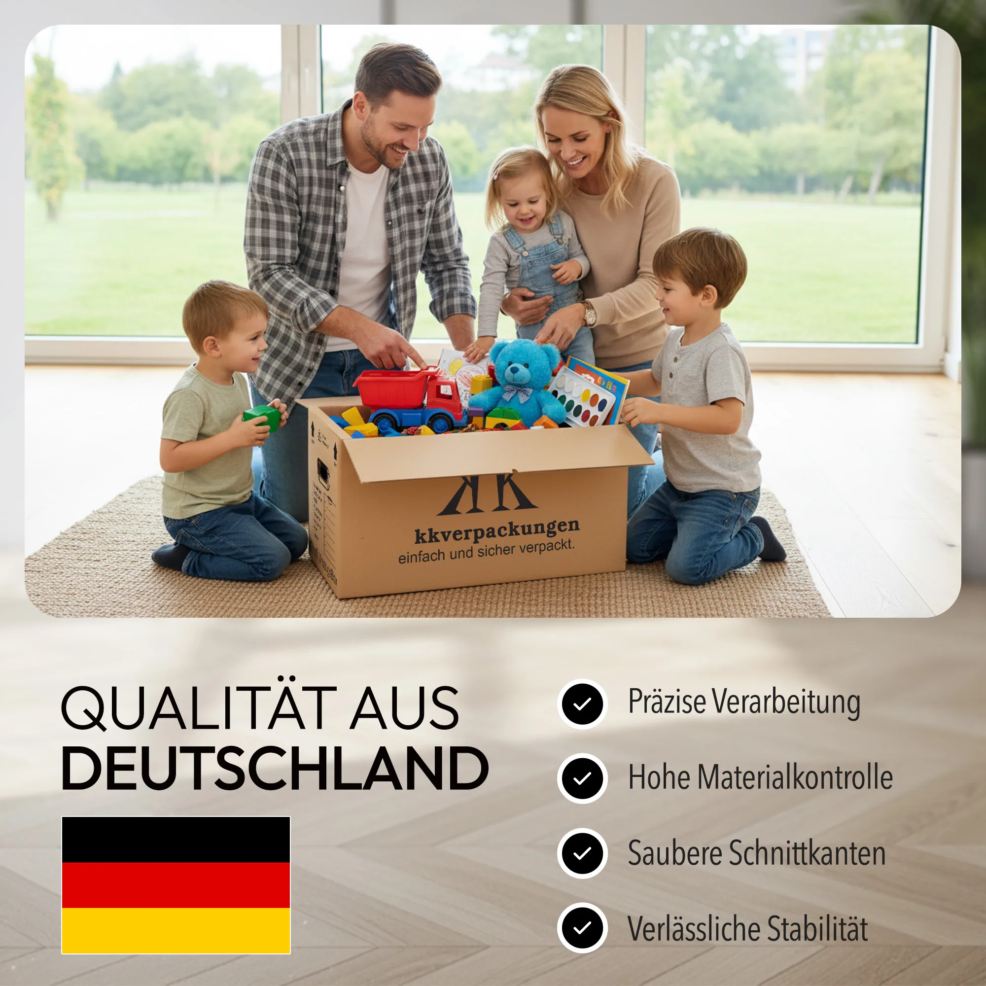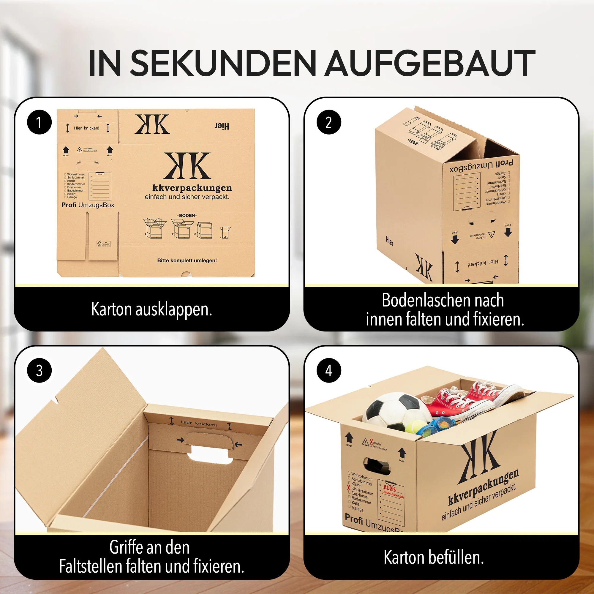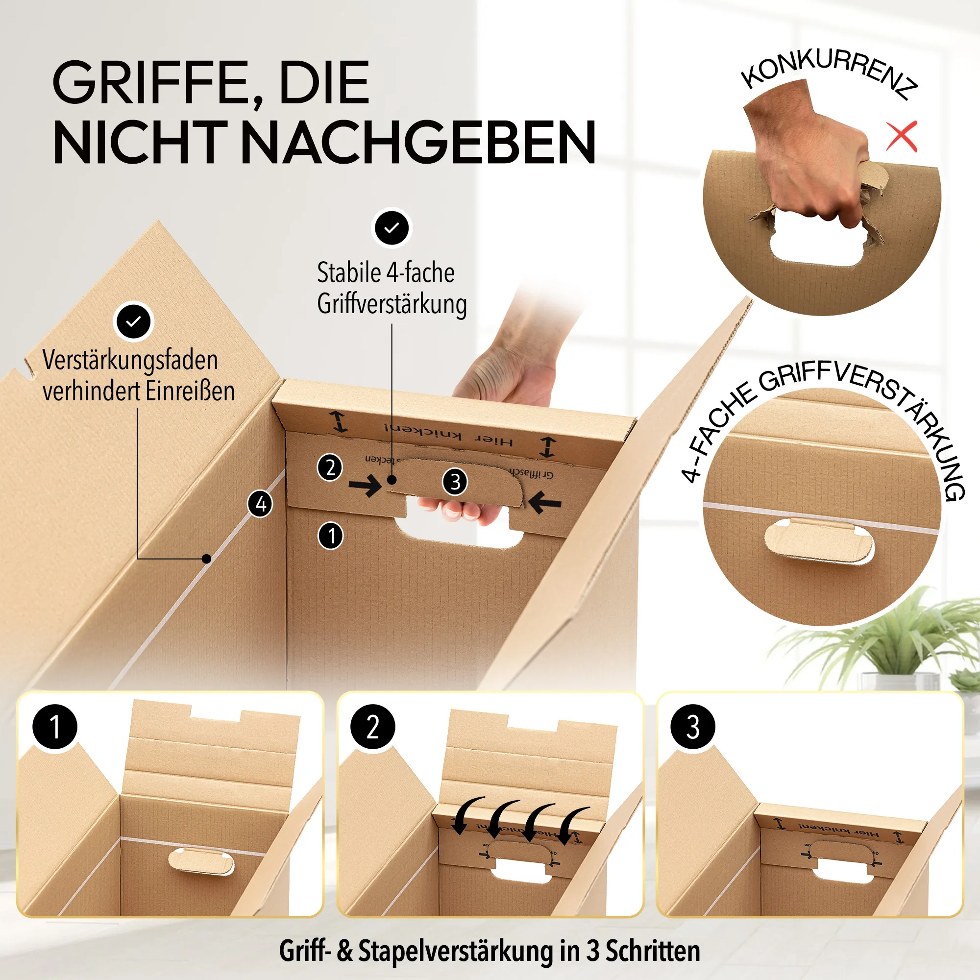 Der extrastabile Schmetterlingsboden lässt sich ohne Klebeband verschließen – ein Vorteil, der sich besonders bei größeren Stückzahlen bemerkbar macht. Sie falten den Karton auf, klappen den Boden ein, und er sitzt. Das spart bei einem Umzug mit Dutzenden oder Hunderten Kartons spürbar Zeit. Eine aufgedruckte Aufbauanleitung unterstützt dabei den schnellen Aufbau.