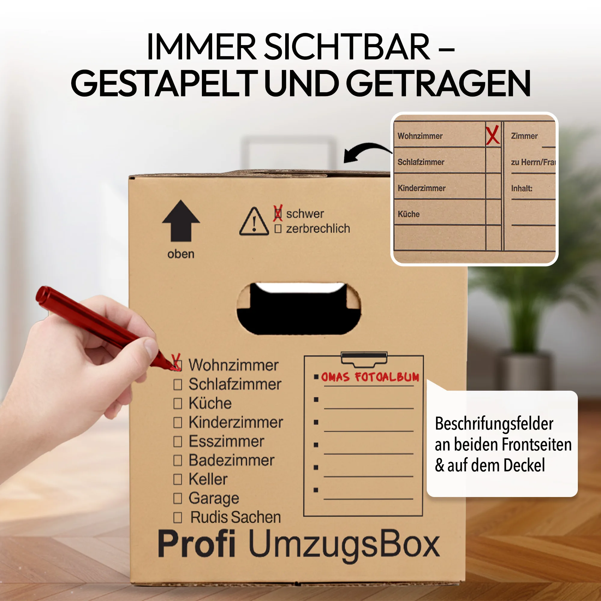 Durch die Stapelfähigkeit lassen sich beladene Kartons im Lkw, im Lager oder im Büro platzsparend übereinanderstellen. Das große Beschriftungsfeld oben am Karton erleichtert dabei die Zuordnung – besonders hilfreich, wenn mehrere Abteilungen oder Räume gleichzeitig gepackt werden.
