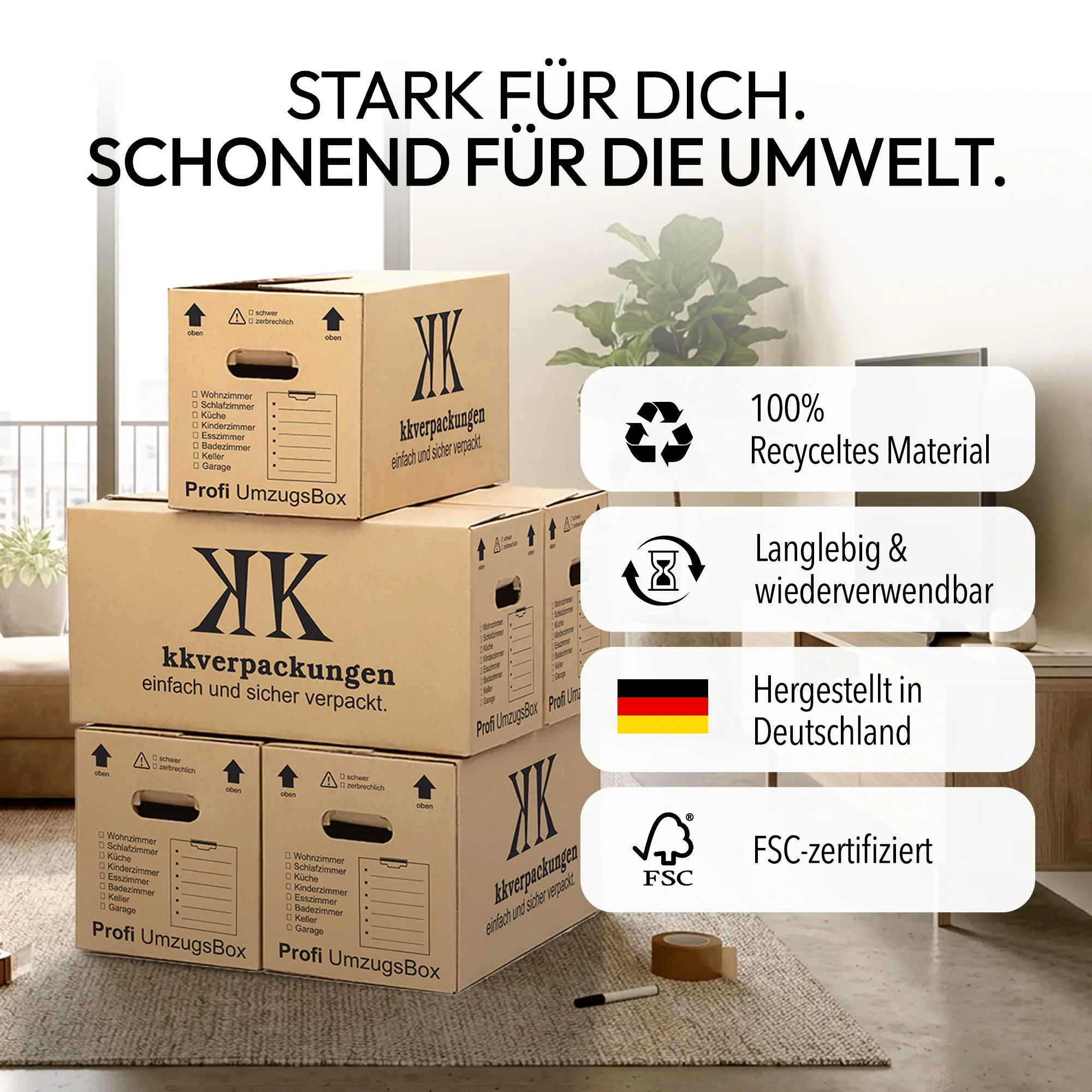 Flachliegend angeliefert, nehmen die Kartons vor dem Einsatz nur wenig Lagerfläche ein. Wellpappe ist zudem recyclingfähig und kann nach dem Umzug über die Altpapierentsorgung dem Wertstoffkreislauf zugeführt werden. So vermeiden Sie unnötigen Abfall und behalten gleichzeitig die Kosten im Griff.