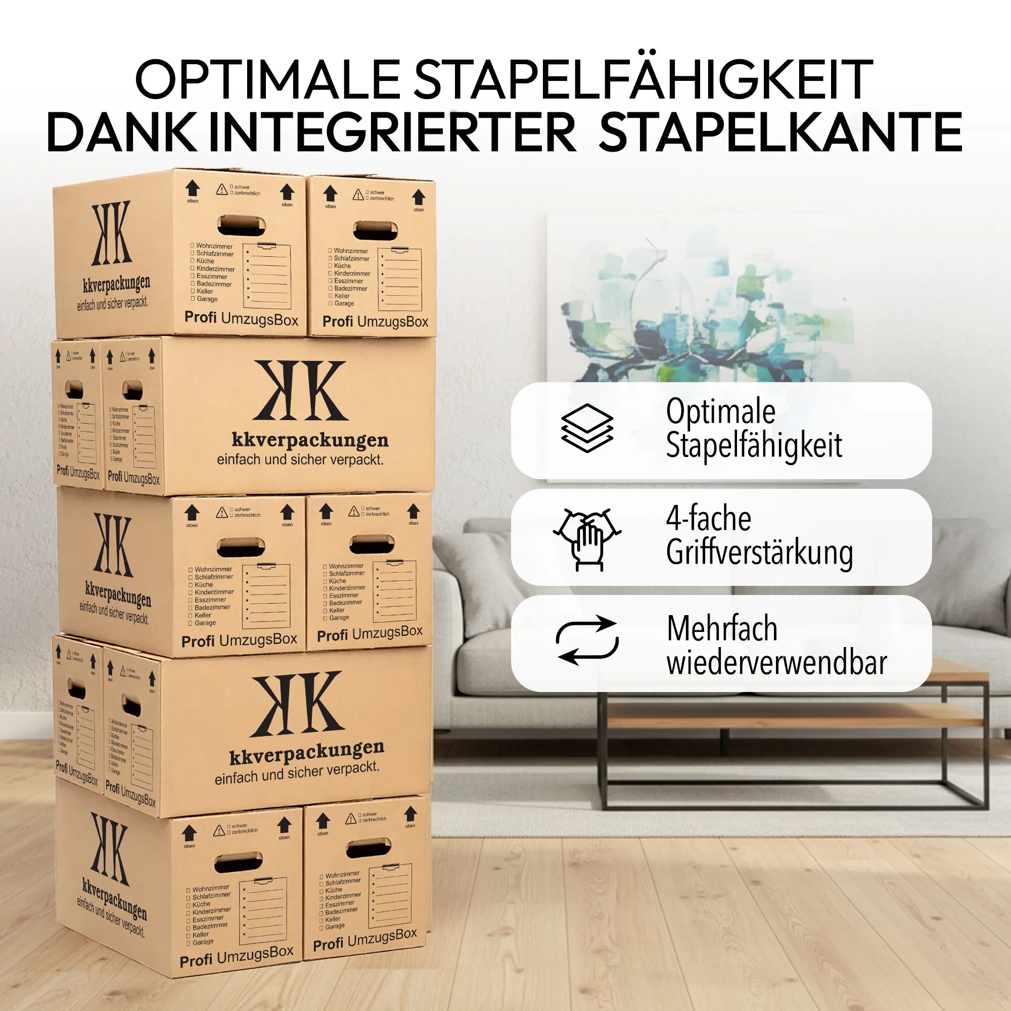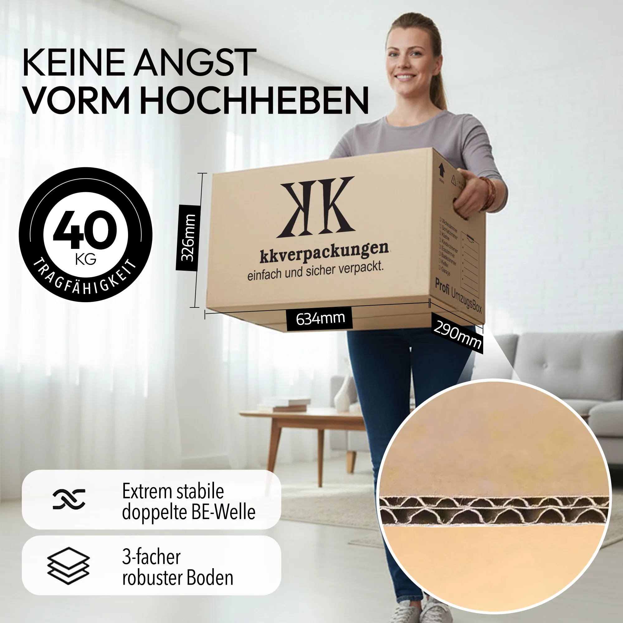 Ob Firmenumzug, Lagerumstrukturierung oder regelmäßiger Warenversand – wer schwere oder empfindliche Gegenstände transportiert, braucht einen Karton, der dabei nicht versagt. Der Umzugskarton Profi ist für genau diese Anforderungen konstruiert. Die doppelwellige Wellpappe in der Qualität 2.20 BE-Welle sorgt dafür, dass die Seitenwände auch unter Belastung formstabil bleiben und eine Traglast von ca. 45 kg ermöglichen.